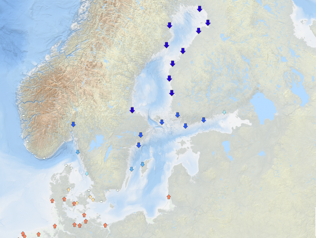 На самом же деле, речь при этом идёт о некоем среднем уровне мирового окена. Конечно, он влияет на локальный уровень моря, но иногда другие факторы влияют больше. Сегодня уровень моря измеряется множеством станций в автоматическом режиме, предоставляющих свободный доступ к этой информации. Благодаря этому мы можем самостоятельно исследовать этот вопрос. Давайте посмотрим, например, на изменение уровня моря у берегов Швеции и Финляндии, в Ботническом заливе Балтийского моря.