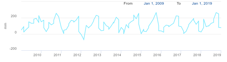 Сезонные колебания локального уровня моря могут вызваны изменением среднего атмосферного давления. Вот график колебаний уровня моря на побережье Аликанте за 10 лет.