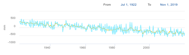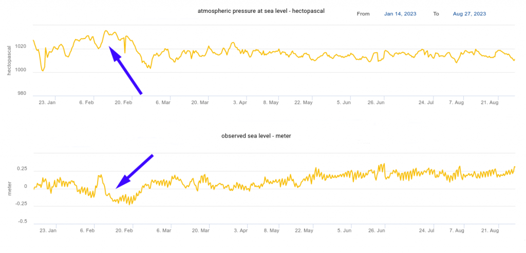Можно заметить ежегодные периодические колебания уровня моря составляющие примерно 20 см. Сопоставив графики атмосферного давления и уровня моря за год, легко убедится в корреляции этих величин. Причём величина сезонного изменения атмосферного давления составляет как раз примерно 20 см водного столба (20 hPa).