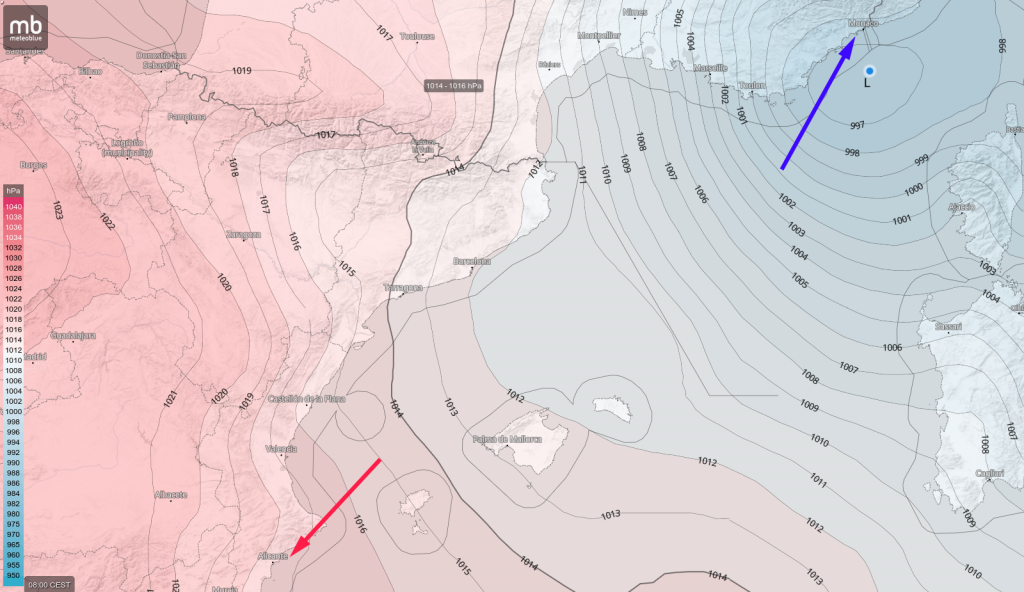 Синяя стрелка указывает на Монако, красная на Аликанте. У побережья Монако атмосферное давление сегодня 997 hPa, а у побережья Аликанте 1017 hPa. Разница – 20 hPa, что соответствует 200 мм “водного столба”. Это значит уровень моря около Аликанте будет ниже на 20 см, по сравнению с уровнем возле Монако, при прочих равных условиях. Атмосфера как-бы выдавливает море в районе побережья Аликанте в те места, где давление ниже.